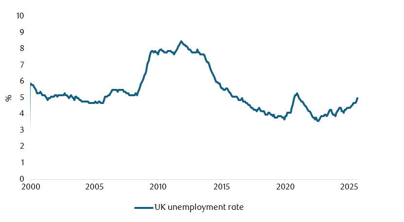 UK economic fragility − the UK economy is suffering from a cautious business sector in anticipation of a tax hiking Autumn Budget. The unemployment rate rose to 5% in the three months to September, increasing the risk of weak consumer demand and late payments for small-to-medium enterprises (SMEs).