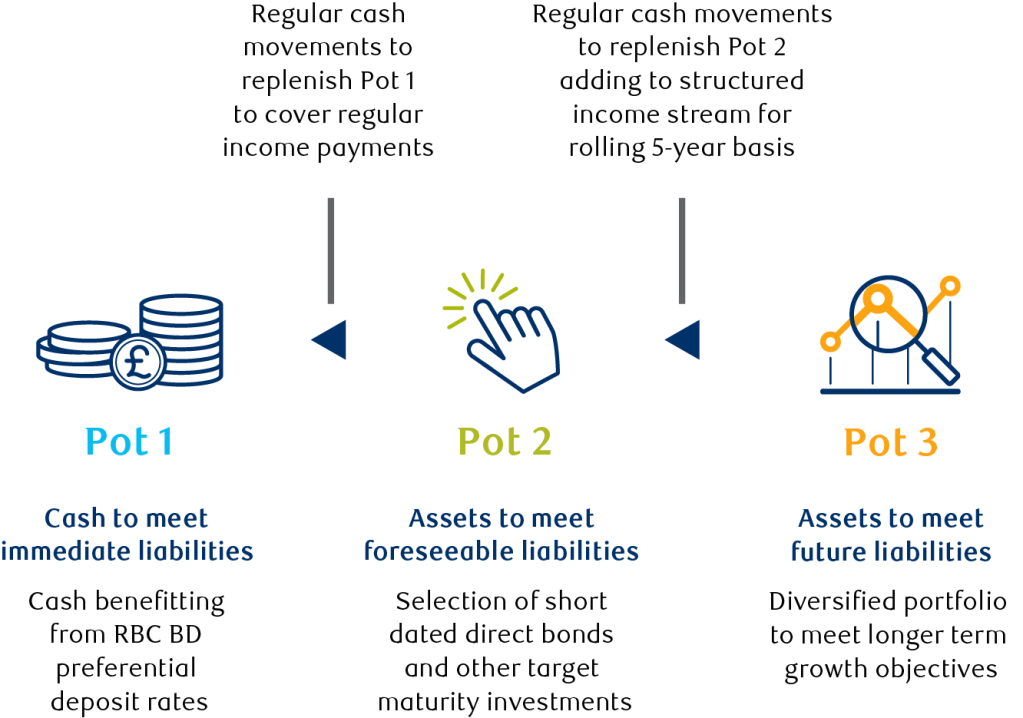Diagram of RBC Brewin Dolphins 3 pot structure which encourages diversified portfolios for longer term growth objectives.